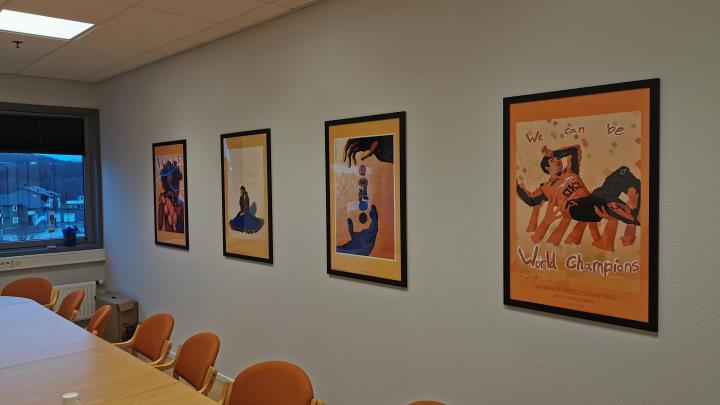 Fire fargerike kunstplakater, laget av vår egen Mina Varsi, pryder møterommet i rådgivergangen på Kirkenes videregående skole. Disse bildene er resultatet av en bestilling fra sosialrådgiver Karin Johansen, som ønsket å skape et hyggelig og trygt rom for gode samtaler og møter.