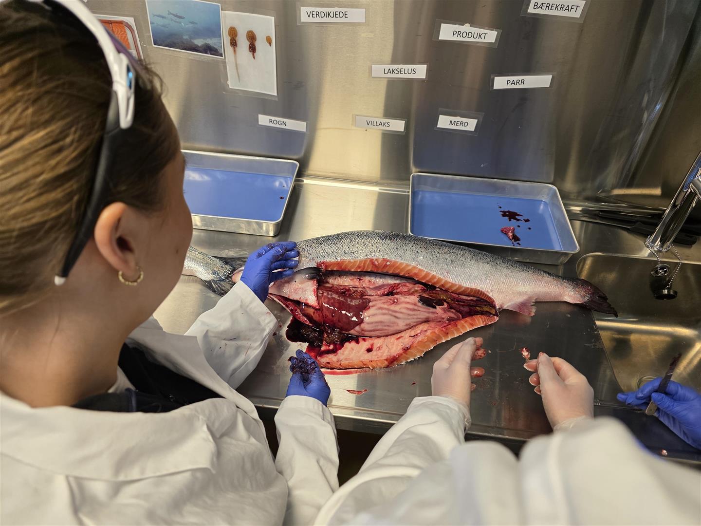 Onsdag 22. april var Biologi 1‑klassen på besøk hos Barents Salmon Centre (Lerøy Aurora). Klassen fikk delta på disseksjon av oppdrettslaks. Elevene fikk selv dissekere fisken, og fikk opplæring i fiskens anatomi under kyndig veiledning av veterinær Hege Skjåvik.