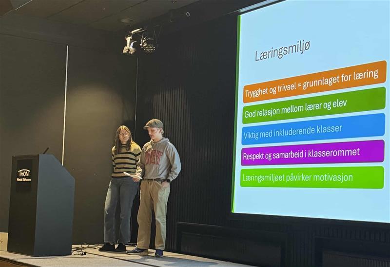 To elever fra Kirkenes vgs. presenterte viktige faktorer for et godt læringsmiljø på dialogkonferansen i Kirkenes.