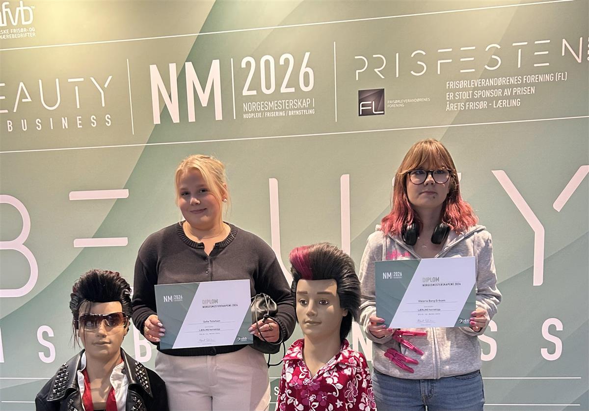 Sterk innsats av frisørlærlinger på Beauty is Business 2026Elever fra frisør Vg3 ved Kirkenes videregående skole deltok lørdag 14. mars på årets Beauty is Business-messe i Lillestrøm. Med temaet Elvis i NM for lærlinger leverte Sofie og Viktoria godt arbeid og tok med seg henholdsvis 4. og 7. plass hjem. Publisert 16.03.2026 12.45 Sist endret 16.03.2026 12.55 Lørdag 14. mars 2026 deltok elever fra frisør Vg3 på den årlige bransjemessen Beauty is Business i Lillestrøm. Dette er en messe hvor du treffer masse fagfolk, får ny inspirasjon og siste nyheter fra leverandører. Her samles fagfolk, lærlinger og leverandører for å hente inspirasjon, lære nye teknikker og holde seg oppdatert på trender og nyheter i faget. Ellen Kristoffersen På programmet står flere konkurranser, inkludert NM for lærlinger, der Sofie og Viktoria fra Kirkenes videregående representerte Kirkenes videregående skole i kategorien herreklipp. Årets tema var ELVIS, og lærlingene våre utførte to flotte arbeid.Innsatsen ga resultater:4. plass til Sofie7. plass til ViktoriaDette er sterke prestasjoner i et mesterskap med høyt nivå og mange deltakere. Ellen Kristoffersen Ellen Kristoffersen Under messen deltok de også på et faglig foredrag ledet av Jan Thomas, som delte erfaringer fra bransjen, ga råd om overgangen til arbeidslivet og motiverte lærlingene til å fullføre utdanningen og stå støtt i yrkesvalget. Ellen Kristoffersen