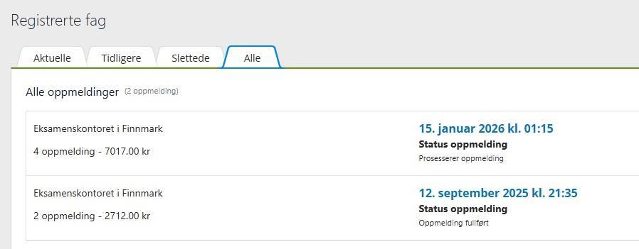 Skjermdump som viser oppmeldingsstatus i Privatistportalen - Klikk for stort bildeSkjermdump som viser oppmeldingsstatus i Privatistportalen